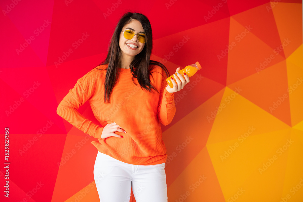 A cheerful young woman wearing sunglasses and a vibrant orange sweater holds a bottle. She is posing against a bold red and orange geometric background, radiating positive energy and happiness.