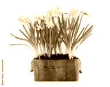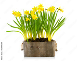 Spring flowers narcises in wooden pot. Gardening floriculture farming. Still life with yellow lent lily, isolated on white background.