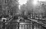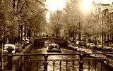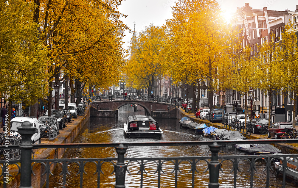 Amsterdam, Netherlands. Panoramic view of autumn Dutch city. Famous channel of Amstel river. Evening cityscape. Colorful sunset scene of famous travel destination in Europe. Romantic traveling place.