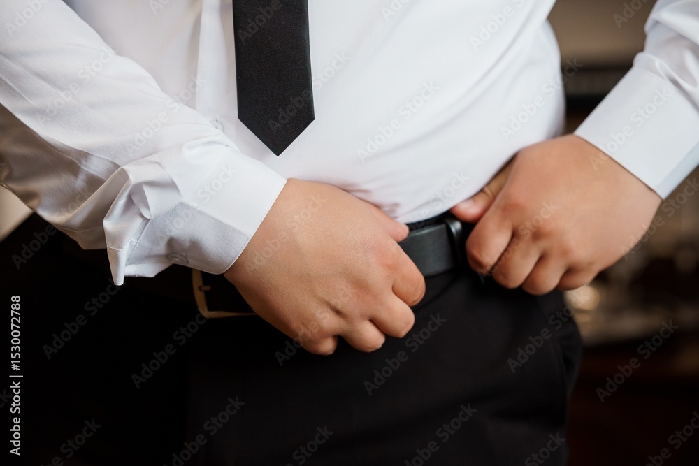 Young Boy Fastening Black Leather Belt with Formal Attire, Close-Up View, Preparing for Event, White Shirt, Dark Pants, Sophisticated Style