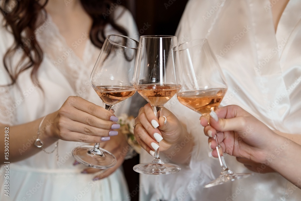 Celebrating Friendship: Women Toasting Rose Wine in Matching Robes, Close-up, Warm Lighting, Bridal Party, Luxury, Joyful, Pink Tones