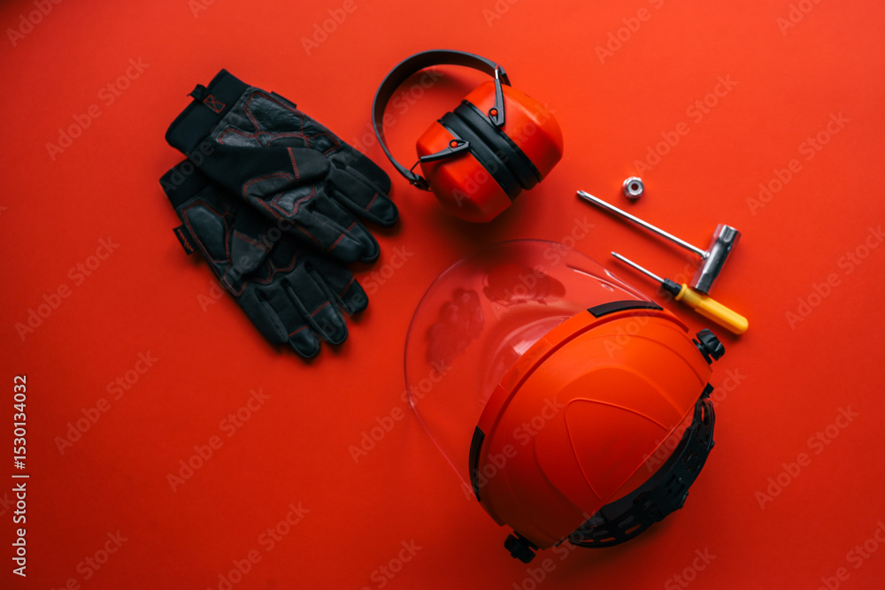 Safety equipment including protective gloves, earmuffs, face shield and hand tools on vibrant orange background, industrial work concept