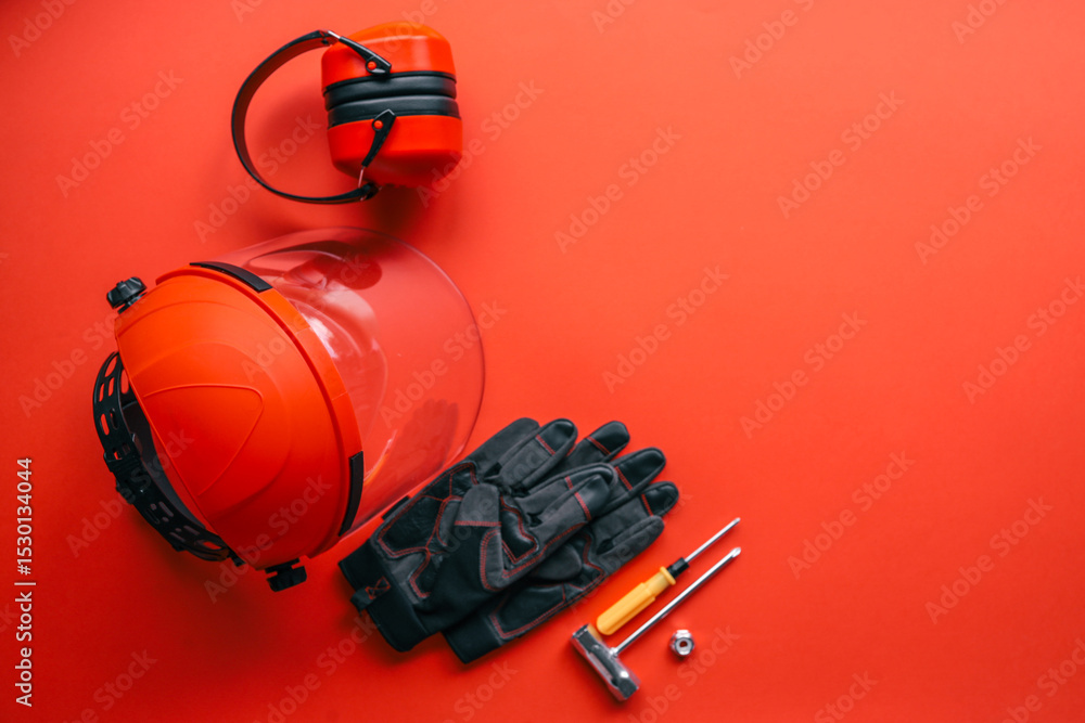 Safety equipment including protective gloves, earmuffs, face shield and hand tools on vibrant orange background, industrial work concept