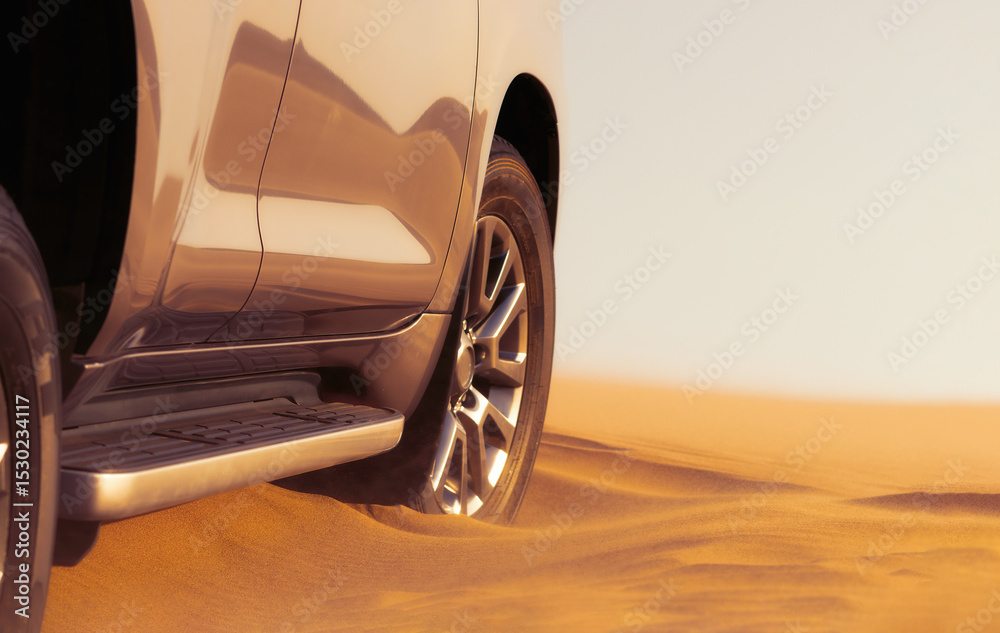 Premium Stock Photo: Close-up of a 4x4 vehicle stuck in deep desert sand, highlighting off-road challenges, adventure, and rugged travel. Ideal for automotive, editorial, and outdoor campaigns.