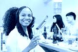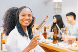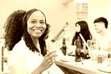 Young black woman on terrace, smiles at the camera with glass, listening music played by her friends