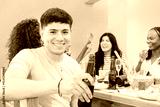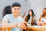 At cheerful gathering of Latin friends playing guitar, young man looks at the camera with beer