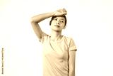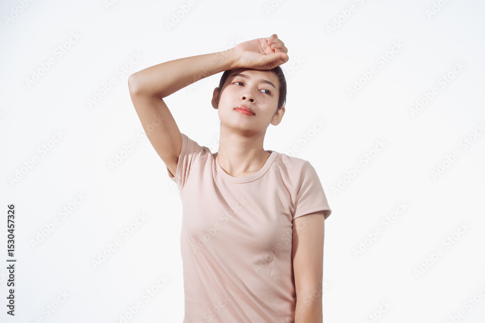 Confident young Asian woman in light brown shirt stands against white background, experiencing headache. Potential causes migraine, tension headache, hormonal changes, TMJ disorder, sinus issues.