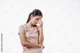 Confident young Asian woman in light brown shirt stands against white background, experiencing headache. Potential causes migraine, tension headache, hormonal changes, TMJ disorder, sinus issues.