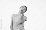 A confident young Asian woman in a light brown shirt stands against a white background, suffering from neck and back pain. Possible causes include muscle strain, disc problems, or spinal conditions.