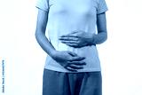 A confident young Asian woman in a light brown shirt stands against a white background, experiencing abdominal pain. Causes may include menstrual cramps, ovarian cysts, endometriosis