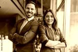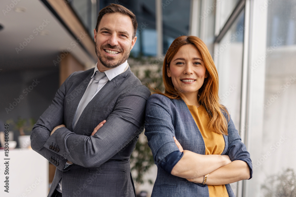 Portrait of manager standing back to back at corporation with arms crossed and smiling at camera.