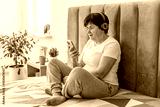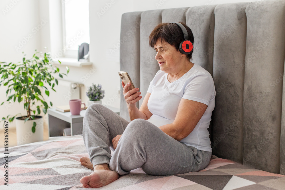 Senior woman listening to music on smartphone