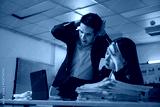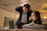 A man and a woman are sitting at a desk with a laptop and a stack of papers