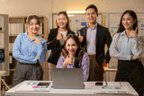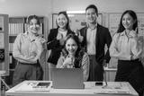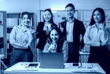 A group of people are standing in front of a computer screen