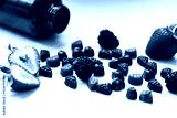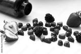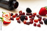 CAssorted berry-shaped gummy vitamins scattered with fresh strawberries and blackberries next to a dark bottle. Bright composition with a healthy, playful summer feel.