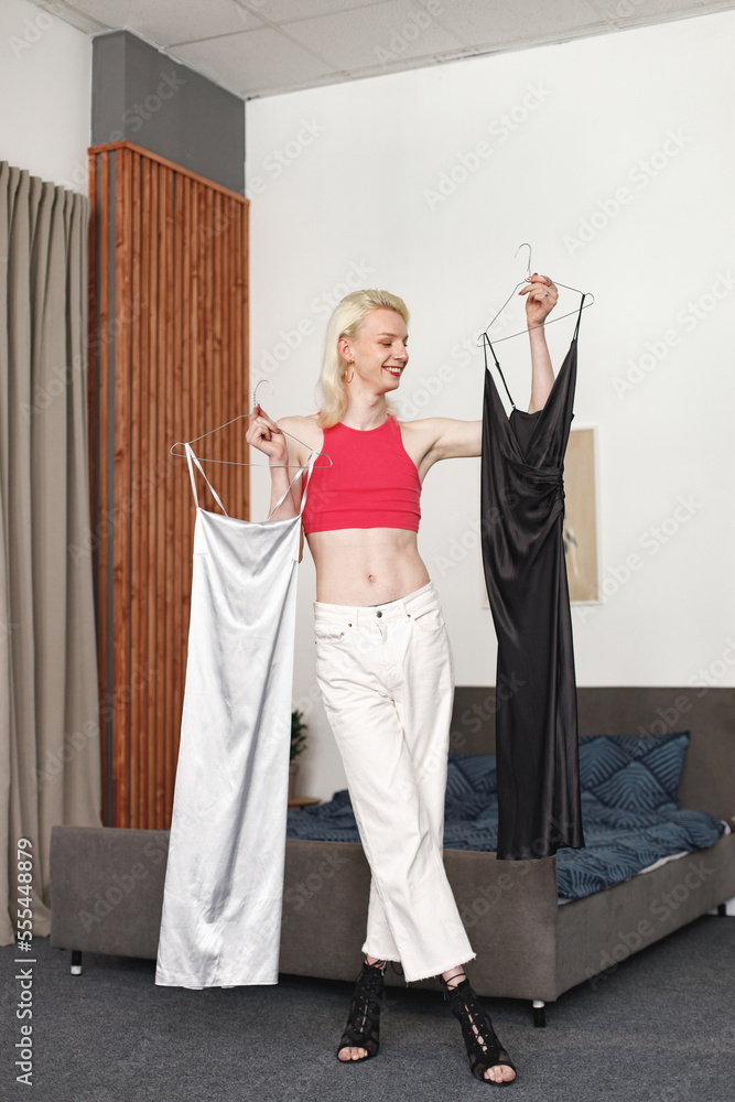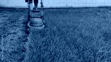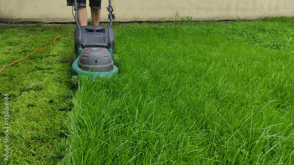 Warsaw, Poland - June 10, 2025: Man mowing lush green lawn with electric lawn mower in residential yard
