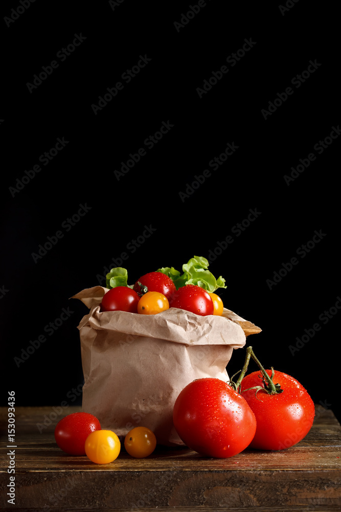 Still life of tomatoes, garlic and parsley on wooden boards. On a black background.