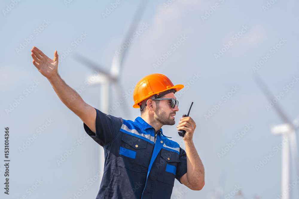 Male man engineer inspection posing check control wind power machine in out door wind energy factory. Young man technician professional worker check wind power machine for maintenance turbine