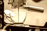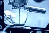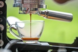 Close-up of a professional espresso machine brewing hot coffee into a clear glass cup on a sunny outdoor patio with blurred green background and shiny metallic components