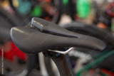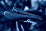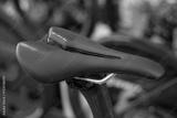 Detail of the sport saddle for bicycle. Elegant black and white racing saddle on the seat post, close-up.Racing bike.