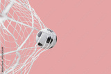 Soccer ball in soccer goal net in a big stadium isolated on pink background. soccer net.