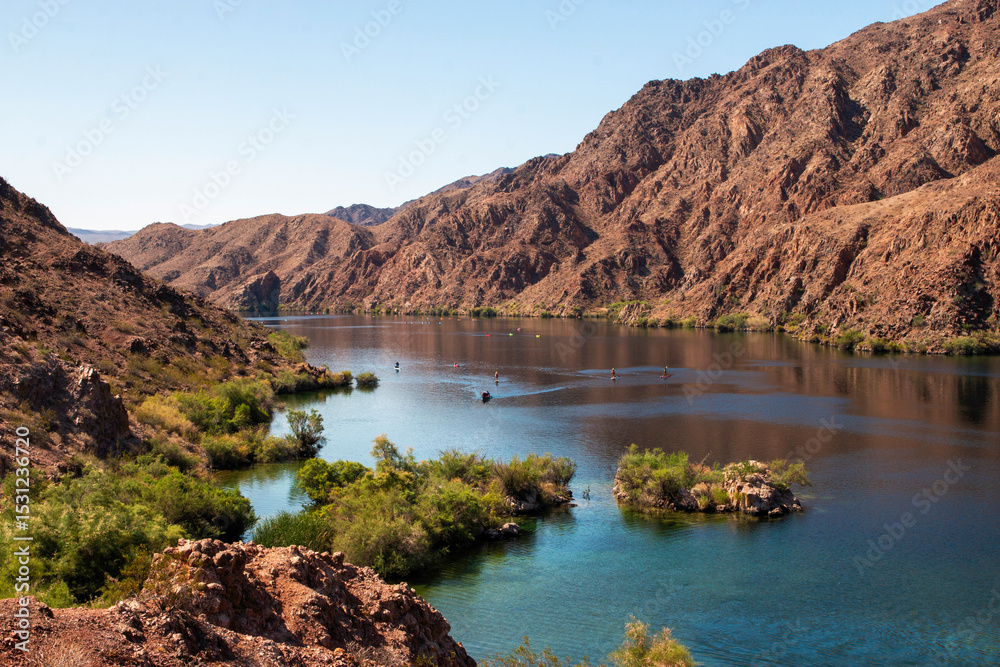 Scenic River View With Rocky Mountains and Clear Blue Sky in Daytime