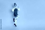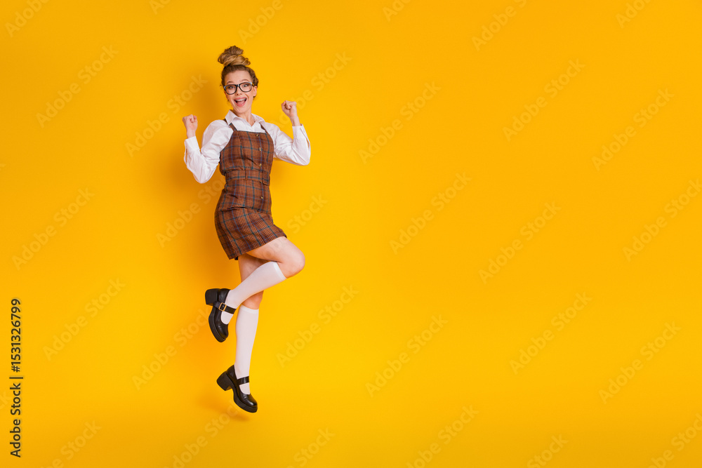 Cheerful young student girl jumping with joy in a school uniform on yellow background expressing happiness and excitement