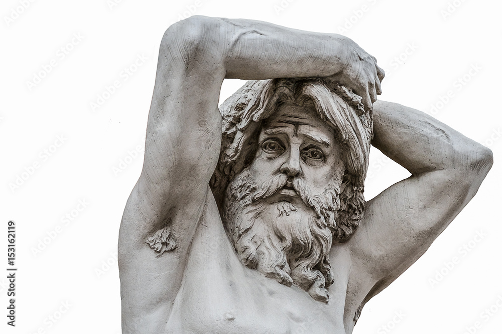 Funny sad face of an ancient man sculpture isolated on white background