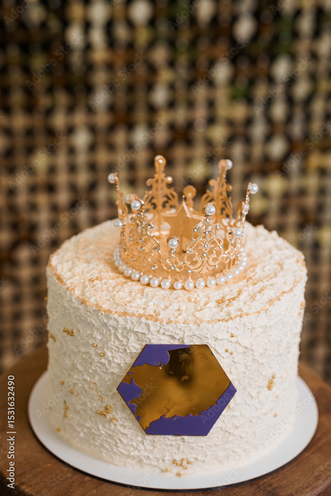 Golden Crown Adorned Peach Birthday Cake with Gold Accents on Wooden Stand. Regal Celebration Dessert Decor