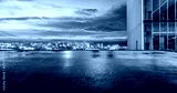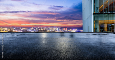 Wet asphalt platform and illuminated modern city skyline at dramatic sunset