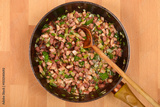 A top-down view shows diced pancetta and chopped green onions being stirred in a dark skillet with a wooden spoon