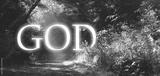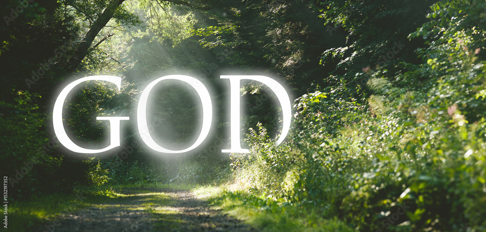 The sign of God on the path through the woods. A concept of faith with nature and sunlight.