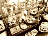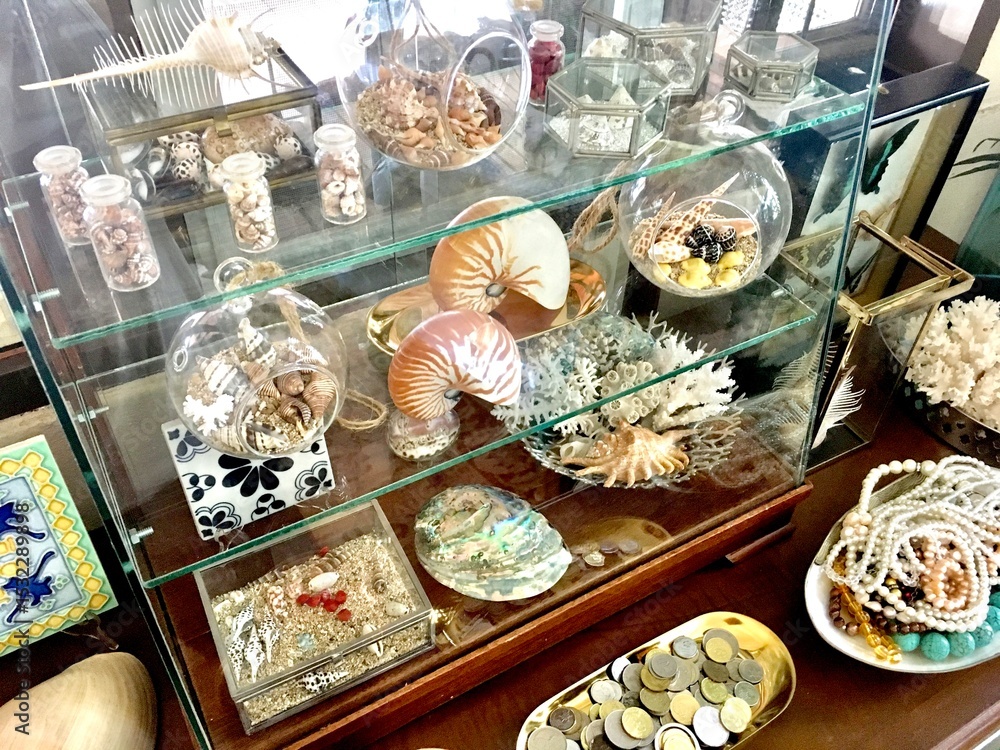 Decorative glass display of assorted seashells and marine-themed ornaments