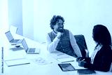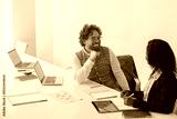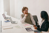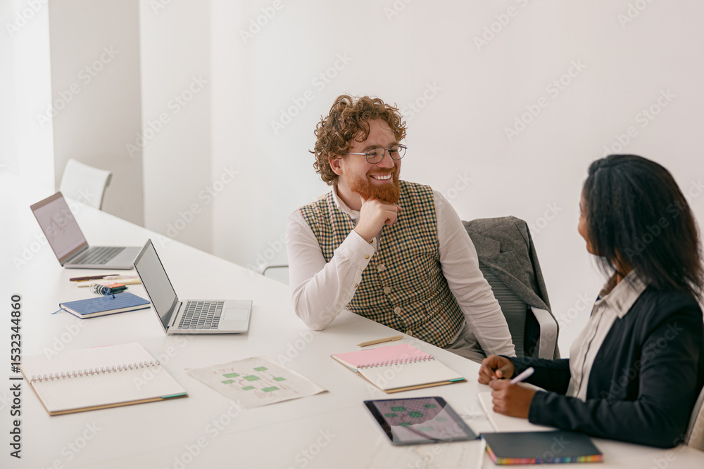 This image captures a candid moment of teamwork and communication occurring in a stylish and modern office setting