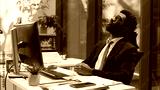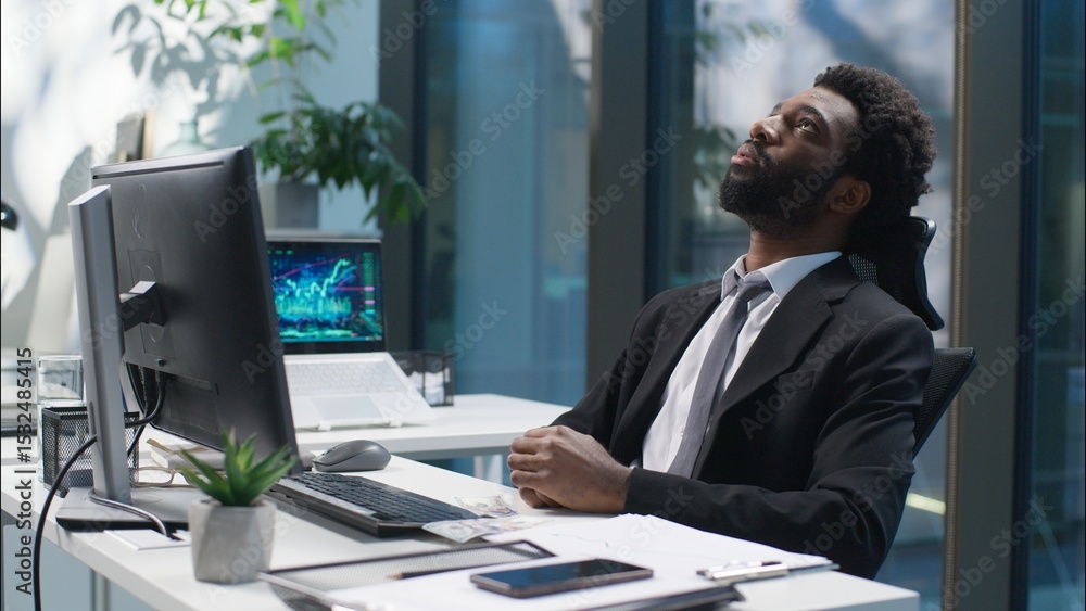 Tired African American man working web online with computer businessman male bored guy business depressed unhappy sad manager employer entrepreneur in office exhausted worker fatigue overwork indoor