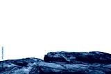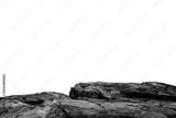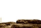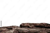 A low-angle, close-up shot of a rugged, dark-brown rock formation against a pure. The rocks are textured, showing varied shades and subtle crevices.