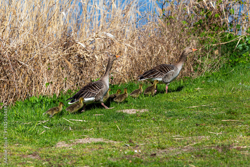 Dzikie kaczki z małymi kaczątkami zmierzające do jeziora.