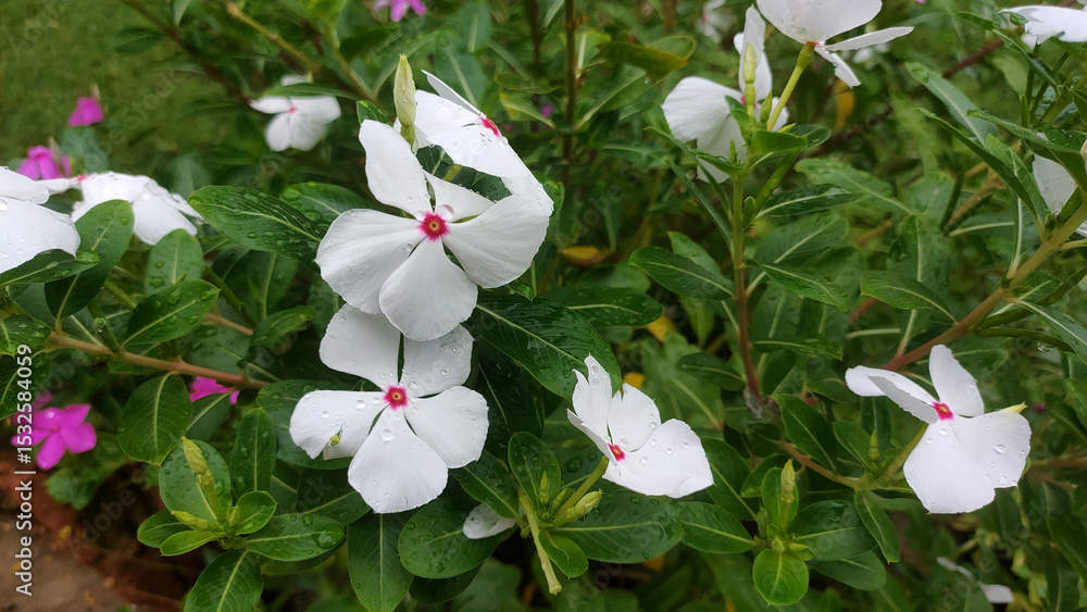 A bunch of white flowers with red centers