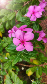 A pink flower is in the foreground of a green bush