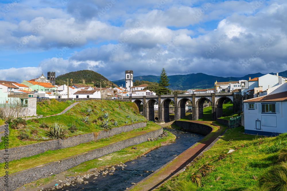 Landscape with river and arch bridge in Ribeira Grande, Sao Miguel, Azores, Portugal.