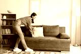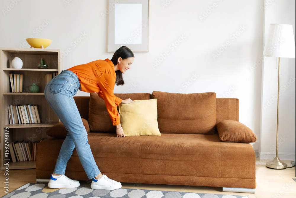 Woman carefully arranging and fluffing throw pillows on sofa, taking pride in her neat and stylishly decorated living room, full length