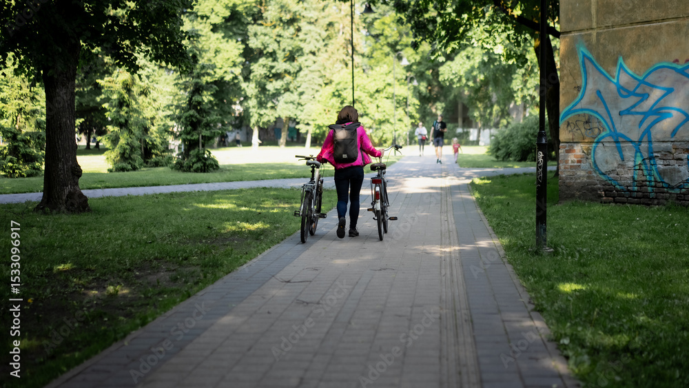 Woman cyclist walking with leading two bicycles in the park ready for getting on with some sport exercises