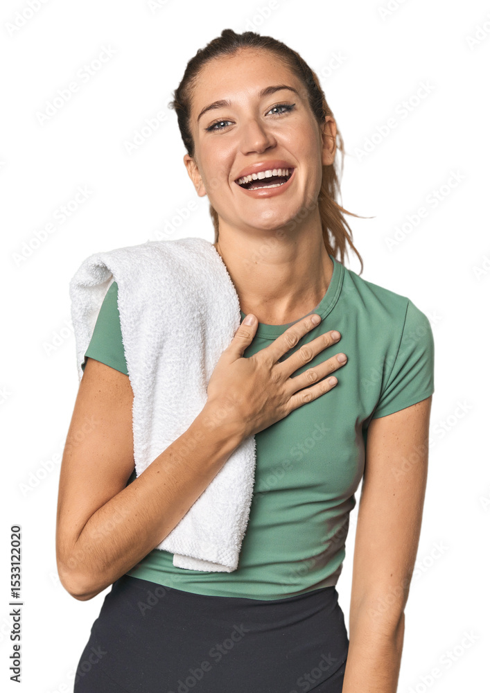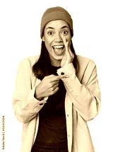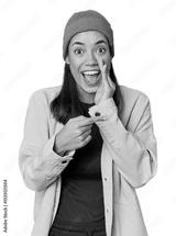 Young Filipino woman in studio saying a gossip, pointing to side reporting something.
