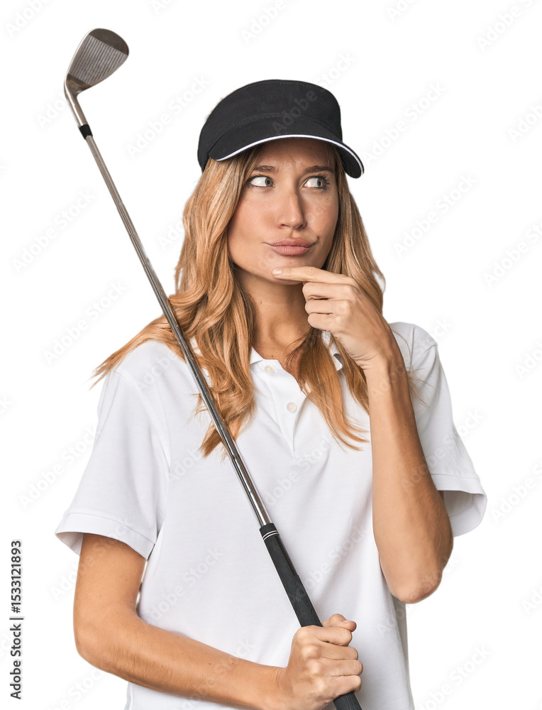 Young blonde golfer in studio looking sideways with doubtful and skeptical expression.