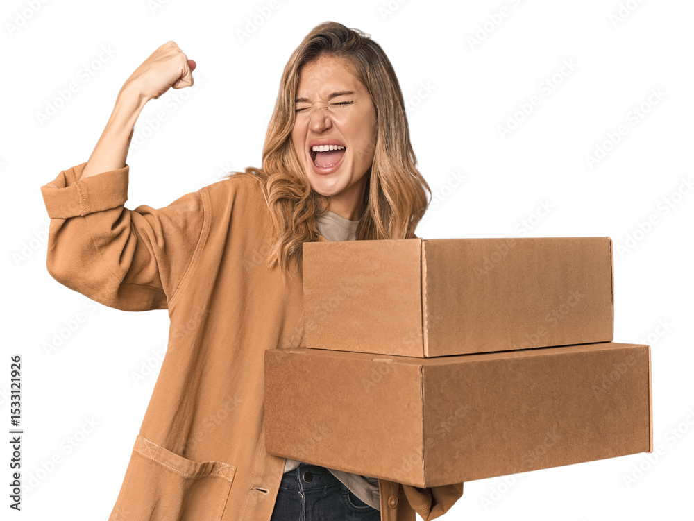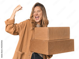 Blonde Caucasian moving with large boxes raising fist after a victory, winner concept.