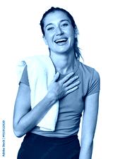Young Caucasian female athlete in studio laughs out loudly keeping hand on chest.