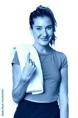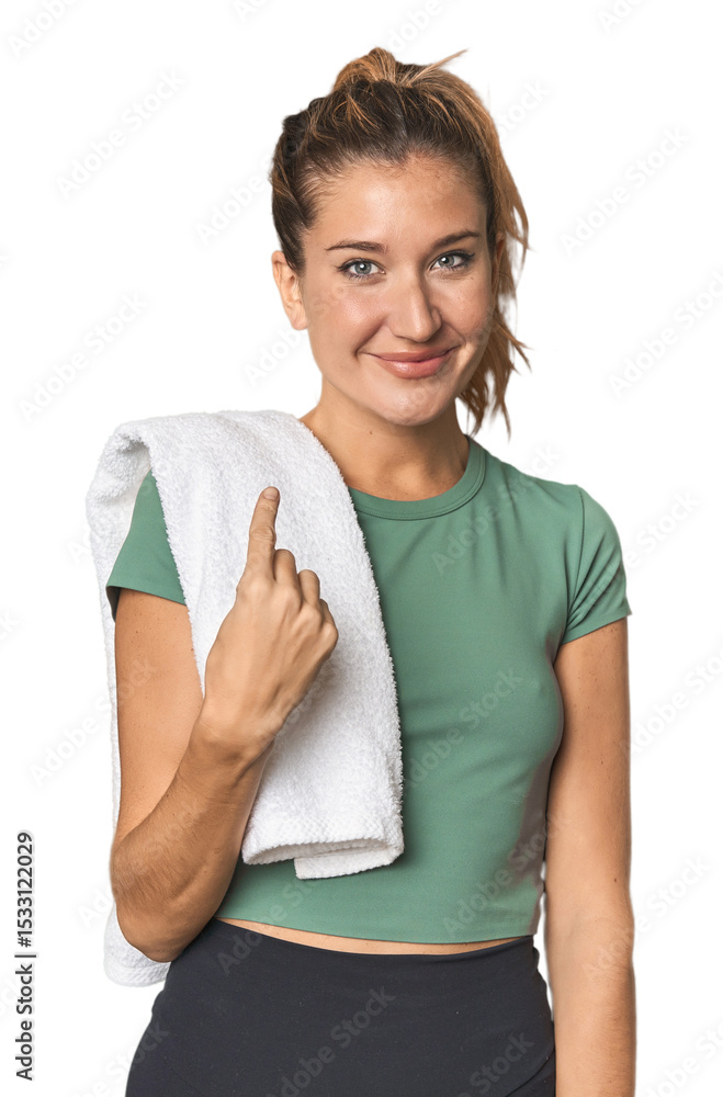 Young Caucasian female athlete in studio pointing with finger at you as if inviting come closer.
