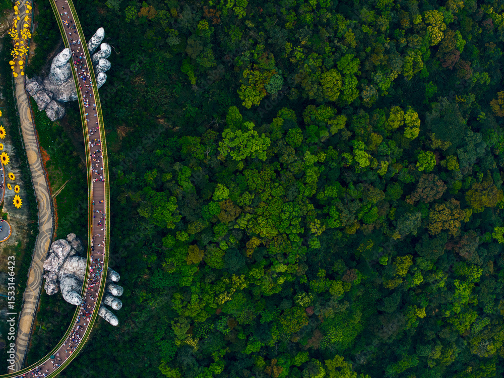Aerial top view of golden bridge at ba na hills in lush Da nang, Vietnam