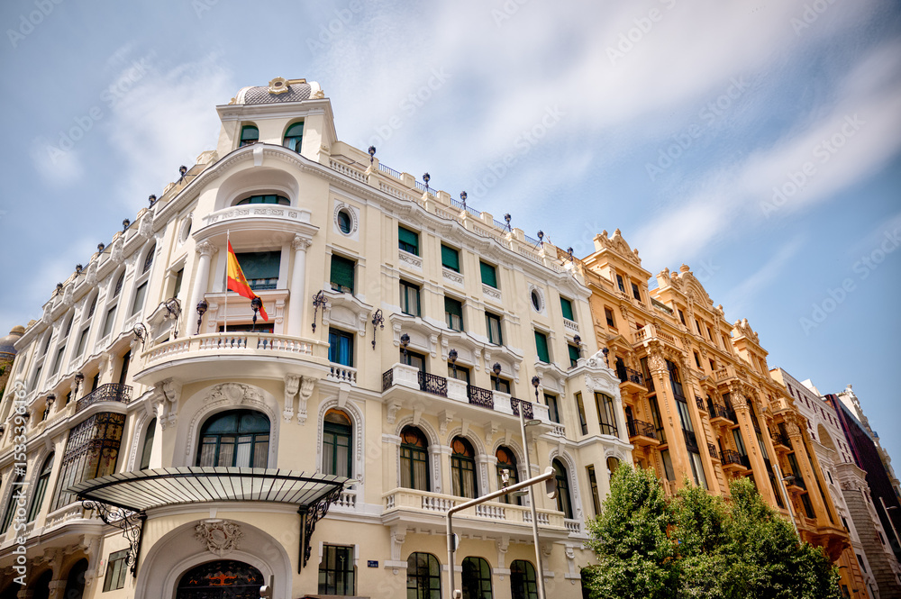 Madrid, Spain - June 1, 2025: Buildings and pedestrians along the streets in Madrid in Spain