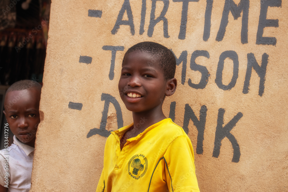 Two young African boys in a Namibian refugee camp, standing quietly against a weathered wall. A powerful image of innocence, hope, and life in humanitarian settings.
